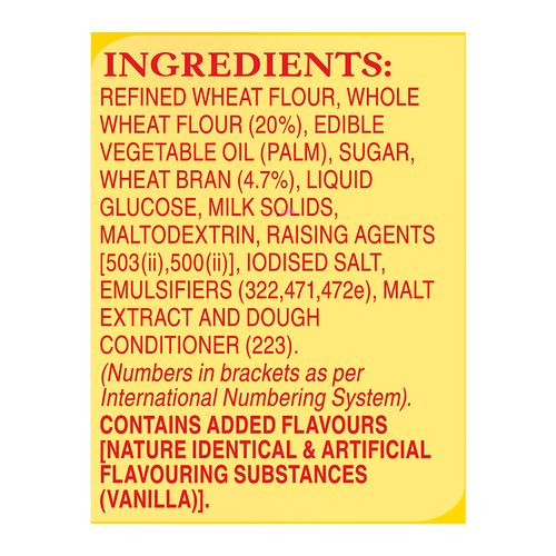 Refined Wheat Flour. Whole Wheat Flour (20%). Edible Vegetable Oil (Palm). Sugar. Wheat Bran (4.7%J, Liquid Glucose, Milk Solids, Maltodextrin. Raising Agents [503(0, 500(0J. Iodised Salt. Emulsifiers (322, 471.472E). Malt Extract And Dough Conditioner (223).