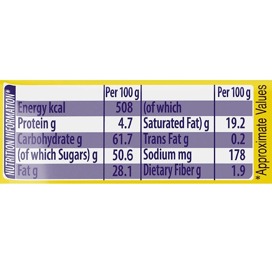 Centre Filling With Caramel & Biscuit 70%*- Sugar, Hydrogenated Vegetable Fat, Liquid Glucose, Milk Solids (11 %), Biscuit 11% (Refined Wheat Flour (Maida), Sugar, Edible Vegetable Fat, Cocoa Solids, Liquid Glucose, Starch, Leavening Agents (501(Ii), 503(Ii), 500(Ii)), Edible Salt, Emulsifier (322)), Edible Vegetable Fat, Invert Sugar, Humectant (422), Emulsifier (322, 471), Iodised Salt.; Milk Chocolate 30%*- Sugar, Cocoa Butter, Milk Solids (4%*), Lactose, Cocoa Solids, Edible Vegetable Fat, Emulsifiers (442,476). Contains Added Flavour (Natural, Nature Identical And Artificial (Caramel And Vanilla) Flavouring Substances) Contains Vegetable Fat In Addition To Cocoa Butter