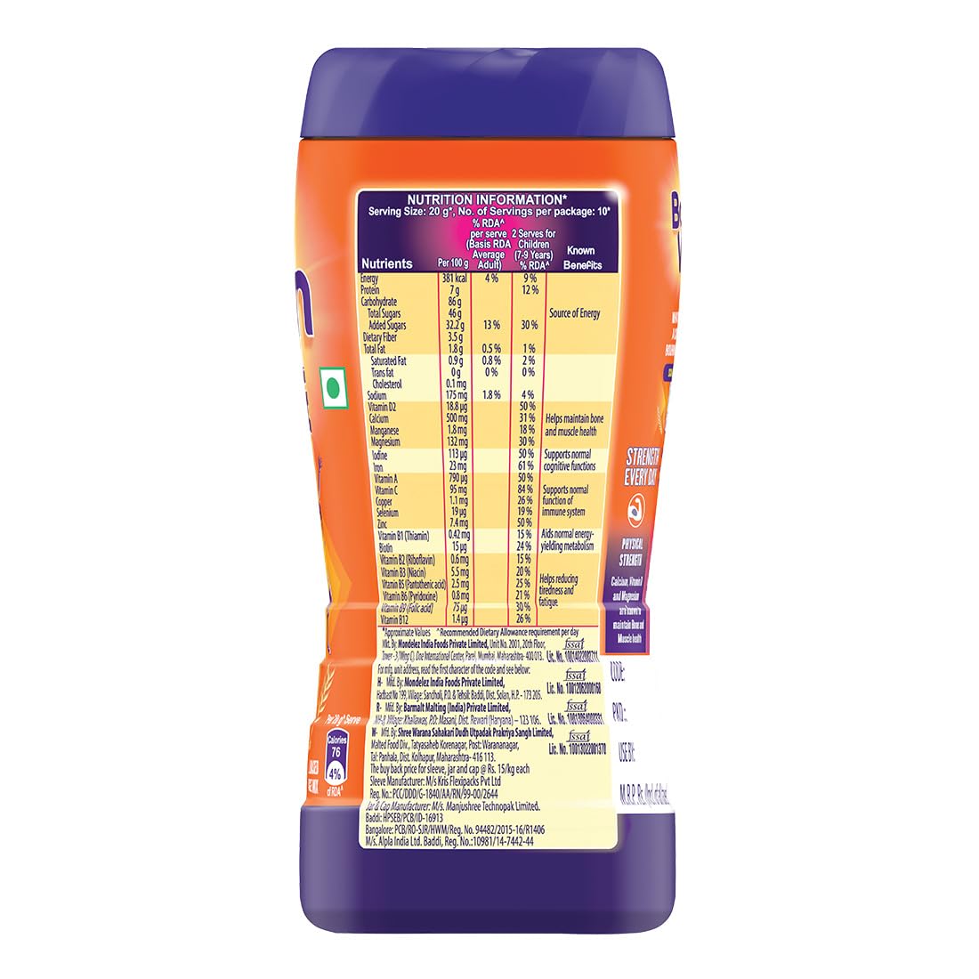 - Strength Every Day+ Bournvita is a scientifically designed formula, crafted by nutritionists with a bundle of nutrients that are known to support Physical strength (Calcium, Vitamin D and Magnesium are known to maintain Bone and Muscle health); Mental Strength (Iron, lodine and Zinc which help in normal cognitive functions); Immune strength (Vitamin C, Vitamin D, Zinc and Iron to support the immune functions). Thus, supporting strength and providing high energy.