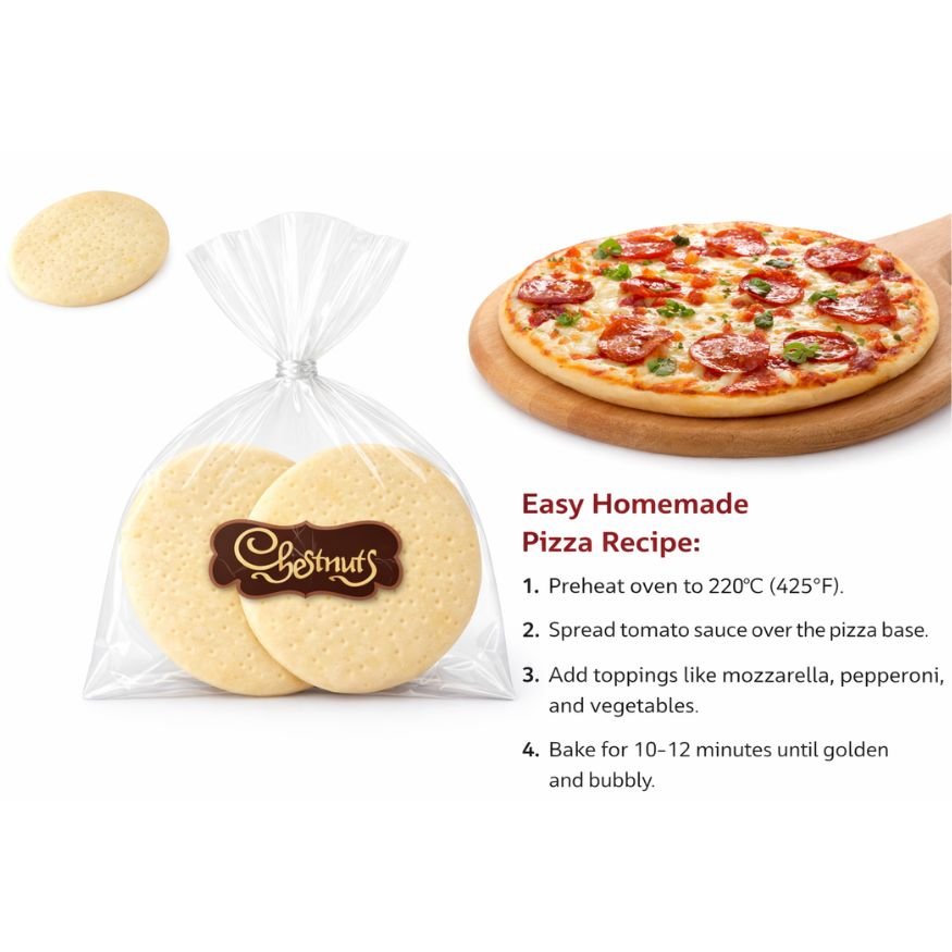 Chestnuts Pizza Base is a soft, evenly baked pizza base made to give you the perfect foundation for delicious homemade pizzas. Prepared using quality ingredients, it offers a light texture with the right balance of softness inside and crispness at the edges. Easy to use and versatile, this pizza base pairs well with a variety of sauces, cheeses, and toppings, making it ideal for quick meals, snacks, or family gatherings. With Chestnuts Pizza Base, creating tasty, restaurant-style pizzas at home becomes simple and convenient.