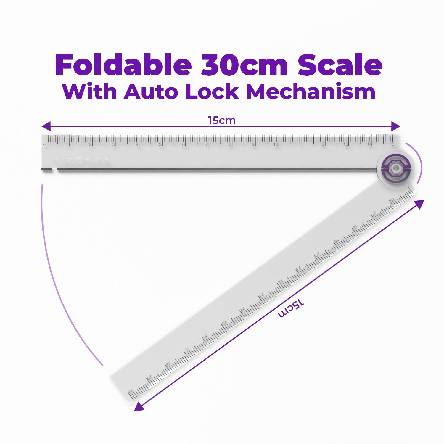 - Foldable 30cm scale with auto press lock for easy storage and use.