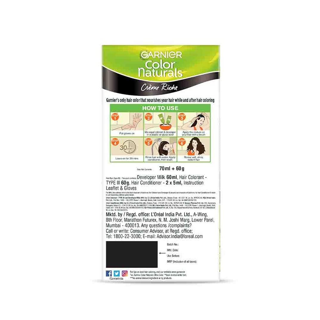 Garnier Color Naturals Crème hair colour gives 100% Grey Coverage and beautiful rich colour. It is an ammonia-free hair colour and has a superior Colour Lock technology which gives you a rich long-lasting colour that lasts up to 8 weeks.