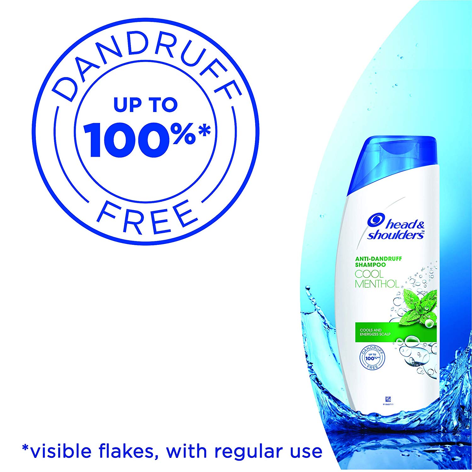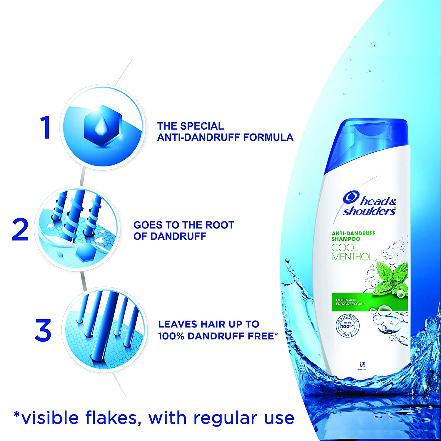 With a shot of tingly menthol for revitalising freshness. Leaves hair up to 100% dandruff free. Gentle enough for everyday use, even for color or chemically treated hair. Formulated with Head and Shoulders’ Fresh Scent Technology featuring enhanced fragrance notes for an improved in-shower scent experience. Up to 100% dandruff free. Visible flakes with regular use.