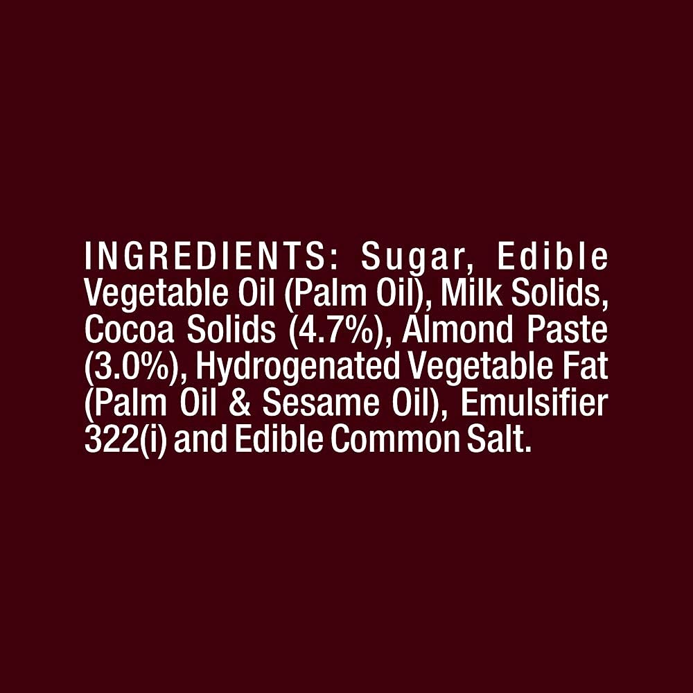 Ingredients: Sugar; Vegetable Oil (sunflower And Palm Oil); Nonfat Milk; Almonds; Cocoa Processed With Alkali; Contains 2% Or Less Of: Hydrogenated Vegetable Oil (palm And Canola Oil); Soy Lecithin; Salt; Natural Vanilla Flavor.