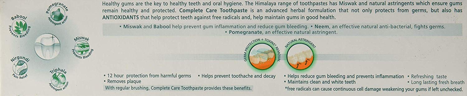 Neem and pomegranate in complete care toothpaste fight germs and give your teeth all day protection. The new Himalaya complete care toothpaste not only protects teeth and gums from germs, but also has antioxidants that assist in removing toxins, helping your gums maintain their natural health.