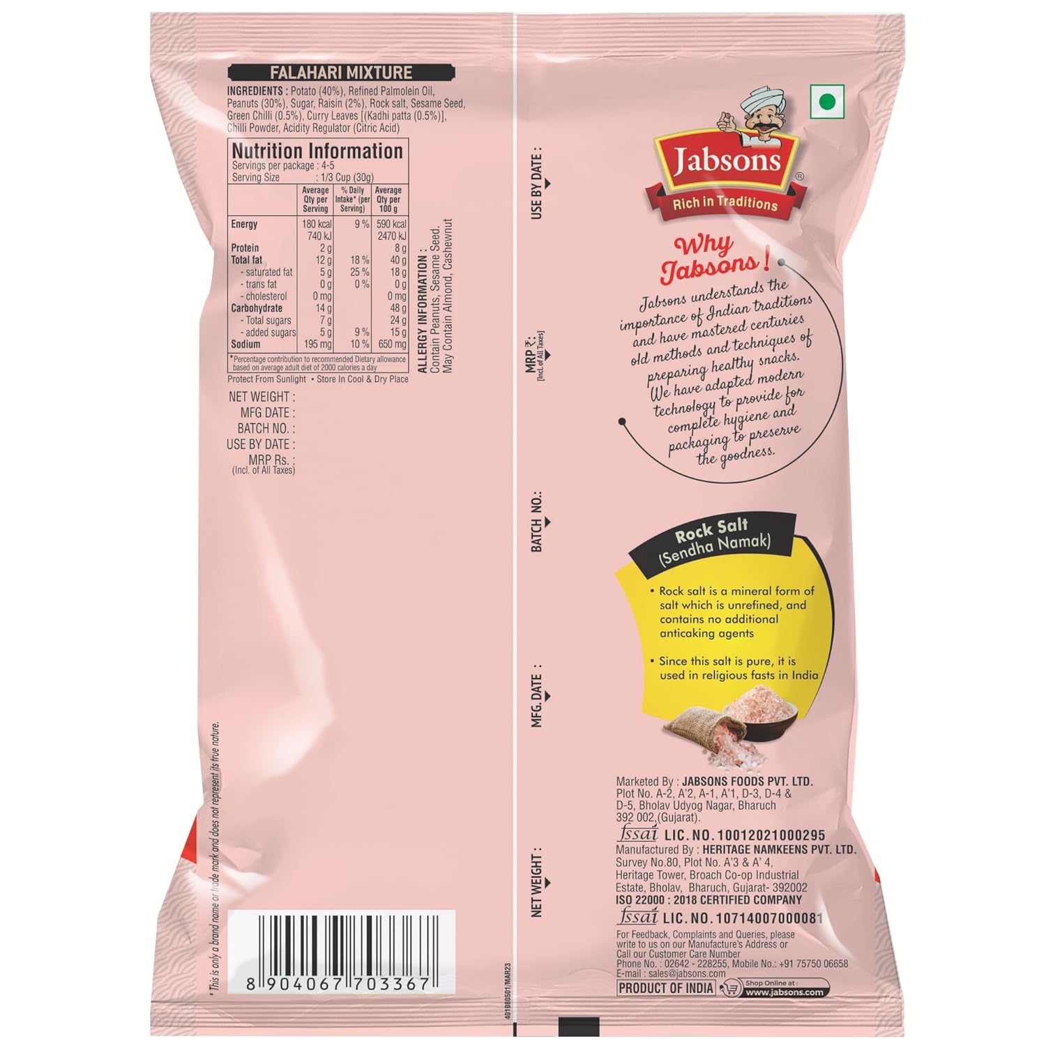 Best quality Namkeen Suitable for all. 100% Vegetarian premium quality falahari mixture Made With Rock Salt (Sendha Namak). Crispy & crunchy upwaas mixture loaded with potato Sticks and peanuts usually consumed in the time of fasting (Upwas). Crispy and Crunchy Falahari Mix. This crunchy & tasty snack is an absolute treat which is loved by both kids and adults. Do not refrigerate, Keep it in a cool & Dry Place away from direct sunlight, Once opened keep the contents in air tight container. Hygienically Made and Packed Without any Preservatives or Artificial Flavors. Health Benefit: Vrat-friendly, made without onion and garlic, suitable for fasting diets. Rock salt offers a natural alternative to regular salt for balanced flavour. A light, crunchy snack that's satisfying without being heavy.
