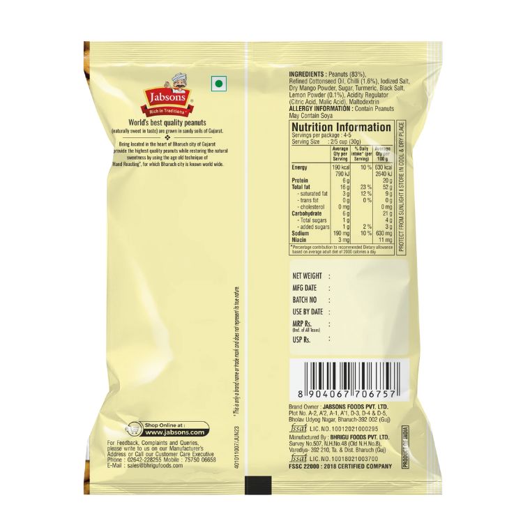 Ingredients: Peanuts (83%), Refined Cottonseed Oil, Chilli, Iodized Salt, Dry Mango Powder, Sugar, Turmeric, Black Salt, Lemon Powder, Acidity Regulator (INS 330, INS 296), Maltodextrin