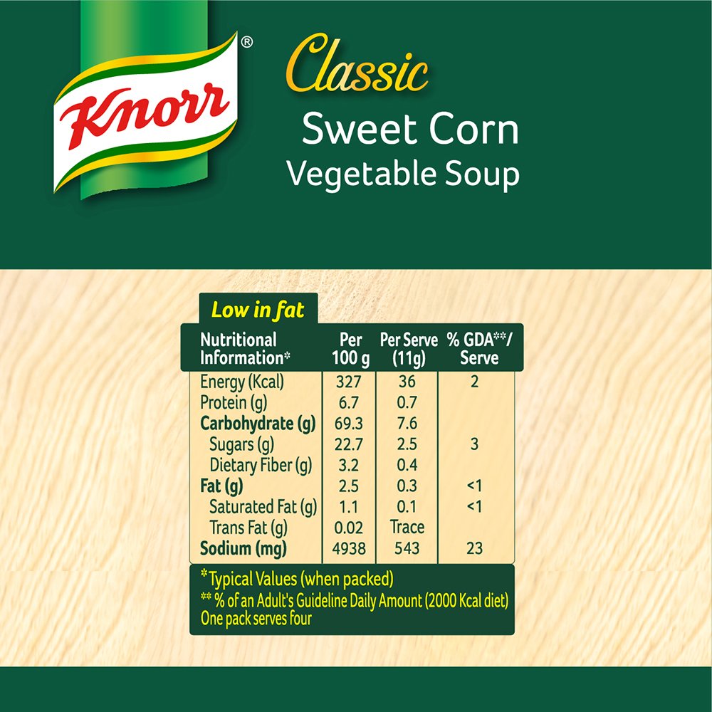 Knorr Sweet Corn Veg Cup-A-Soup is a perfect blend of corn, carrots, cabbage makes this cup-a-soup an instant hit. Knorr Sweet Corn Veg Cup-A-Soup satisfies your small hunger pangs in just 1 minute. Its crunchy, delcious and easy to make every time. Made with 100% real vegetables and no added preservatives, this soup is ready in three simple steps. So now enjoy Restaurant like delicious Soup at home.Knorr Soups range comprises of 11 delicious flavours of 4 serve soups and 7 flavours of Cup-a-soup.