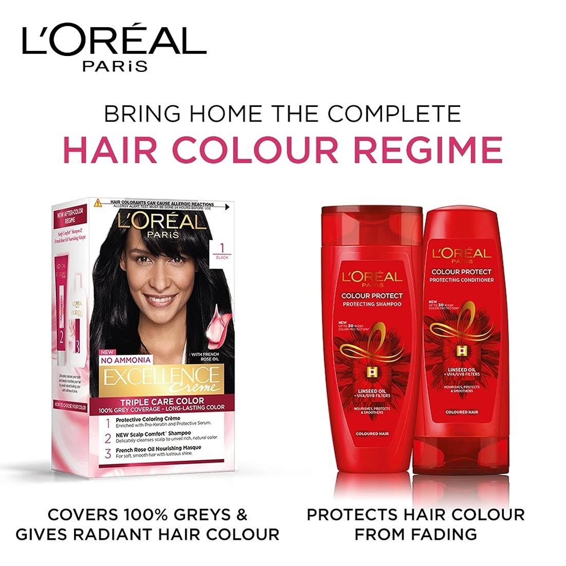 • Contents: 1x L'Oréal Paris Excellence Crème Permanent Hair Dye, Radiant At-Home Hair Colour with up to 100% Grey Coverage, Pro-Keratin, Up to 8 Weeks of Colour, 1 Black, 70ml+100gm.