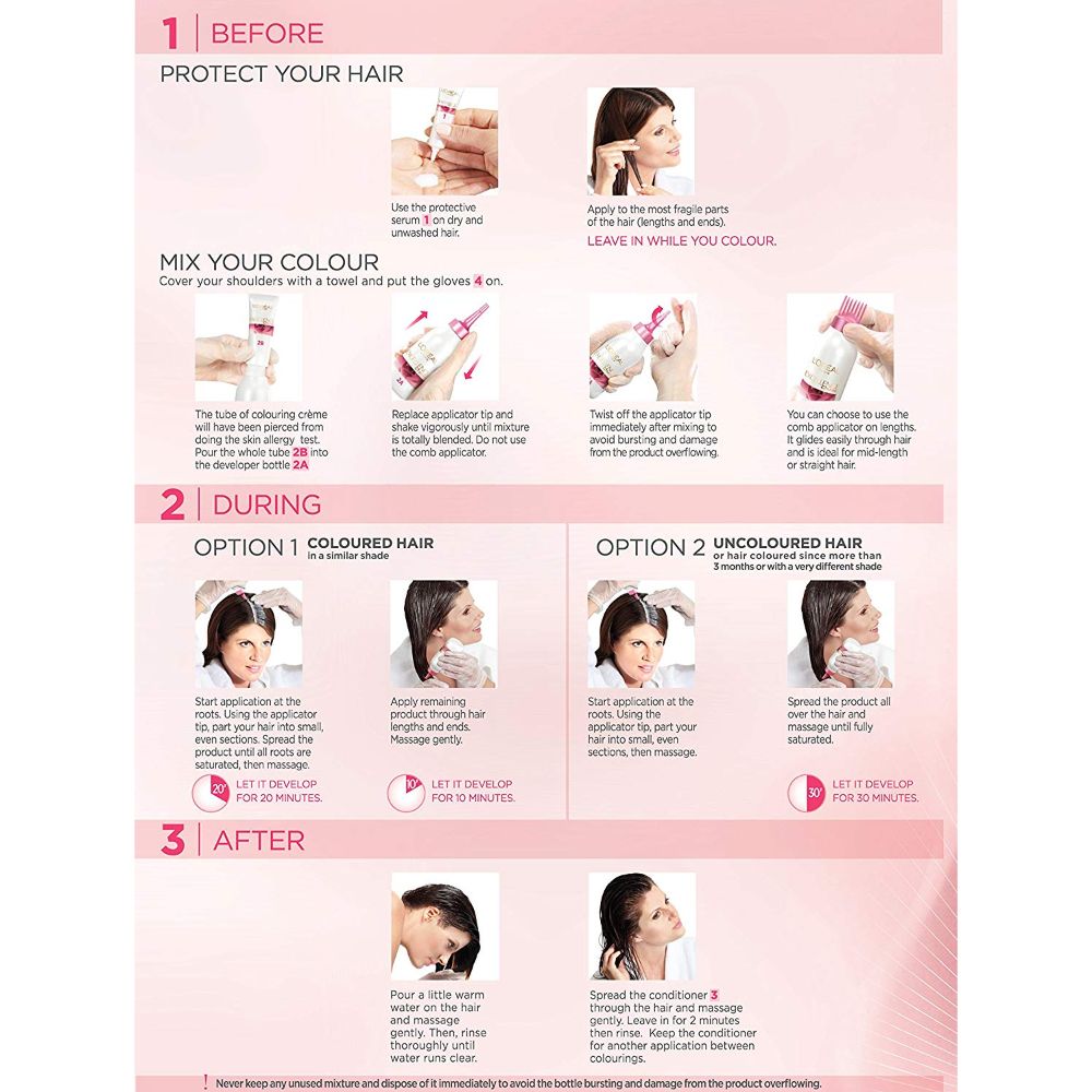 • Read instructions and patch test 48 hours before use: 1.) Use gloves and pour colouring into developer bottle and shake to mix, 2.) Apply colour and leave for recommended time, 3.) Shampoo out and follow with conditioning mask.