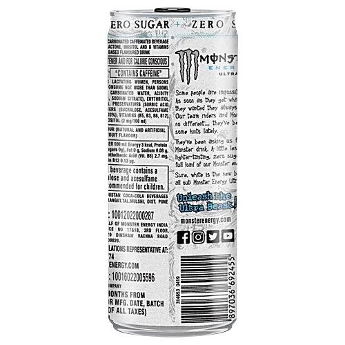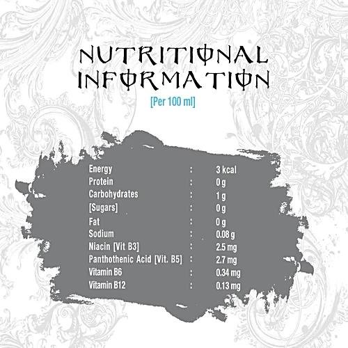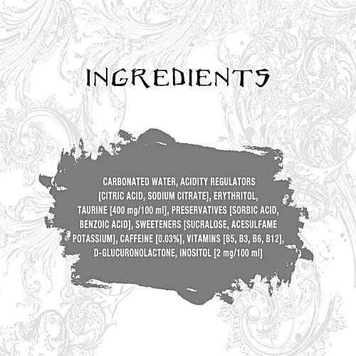Carbonated Water, Acidity Regulators [Citric Acid, Sodium Citrate], Erythritol, Taurine [400 mg/100 ml), Preservatives [Sorbic Acid, Benzoic Acid], Sweeteners [Sucralose, Acesulfame Potassium], Caffeine [0.03%], Vitamins [B5, B3, B6, B12], D-Glucuronolactone, Inositol [2 mg/100 ml]