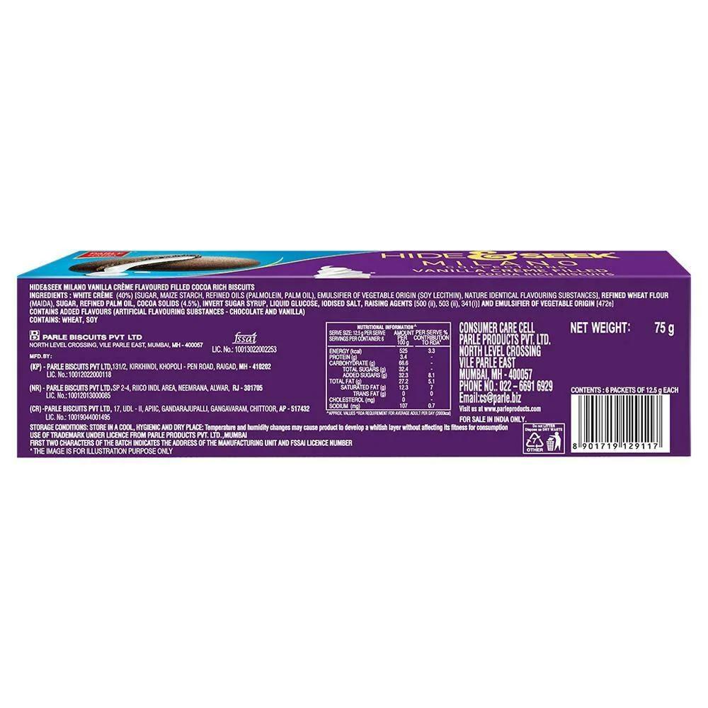 f you're looking for delicious biscuits to snack on during tea-time.Parle Hide & Seek Milano Centre Filled Vanilla Cookies It's incredibly tasty, and each bite will leave you wanting for more. It's made from the finest quality ingredients and its hygienic packaging ensures that the product remains fresh over a period of time. So go ahead, buy it online today!