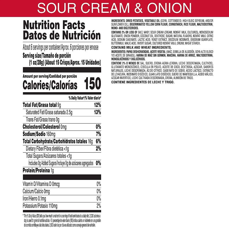 Dried Potato (50%), Edible vegetable oil, Wheat starch, Sour Cream and Onion seasoning (5.5%), (Maltodextrin, Dextrose, Salt, Milk solids (0.8%), Onion powder (0.8%), Natural flavoring substances (Sour Cream, Parsley), Anticaking agent (INS 551), Edible vegetable oils, Flavour enhancers (INS 627, 631), Acidity regulator (INS 341), Emulsifier (IS 414), Nature identical flavoring substances, Starch, Preservative (INS 220), Antioxidant (INS 307)), Rice flour, Emulsifier (INS 471), Maltodextrin, Dextrose, Acidity regulator (INS 330).