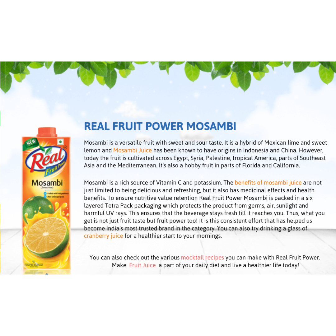 Sweet Lime also known as Mosambi is a versatile fruit with sweet and sour taste. Packed with 20 fruits, Real Mosambi is a refreshing source of Vitamin C and potassium!