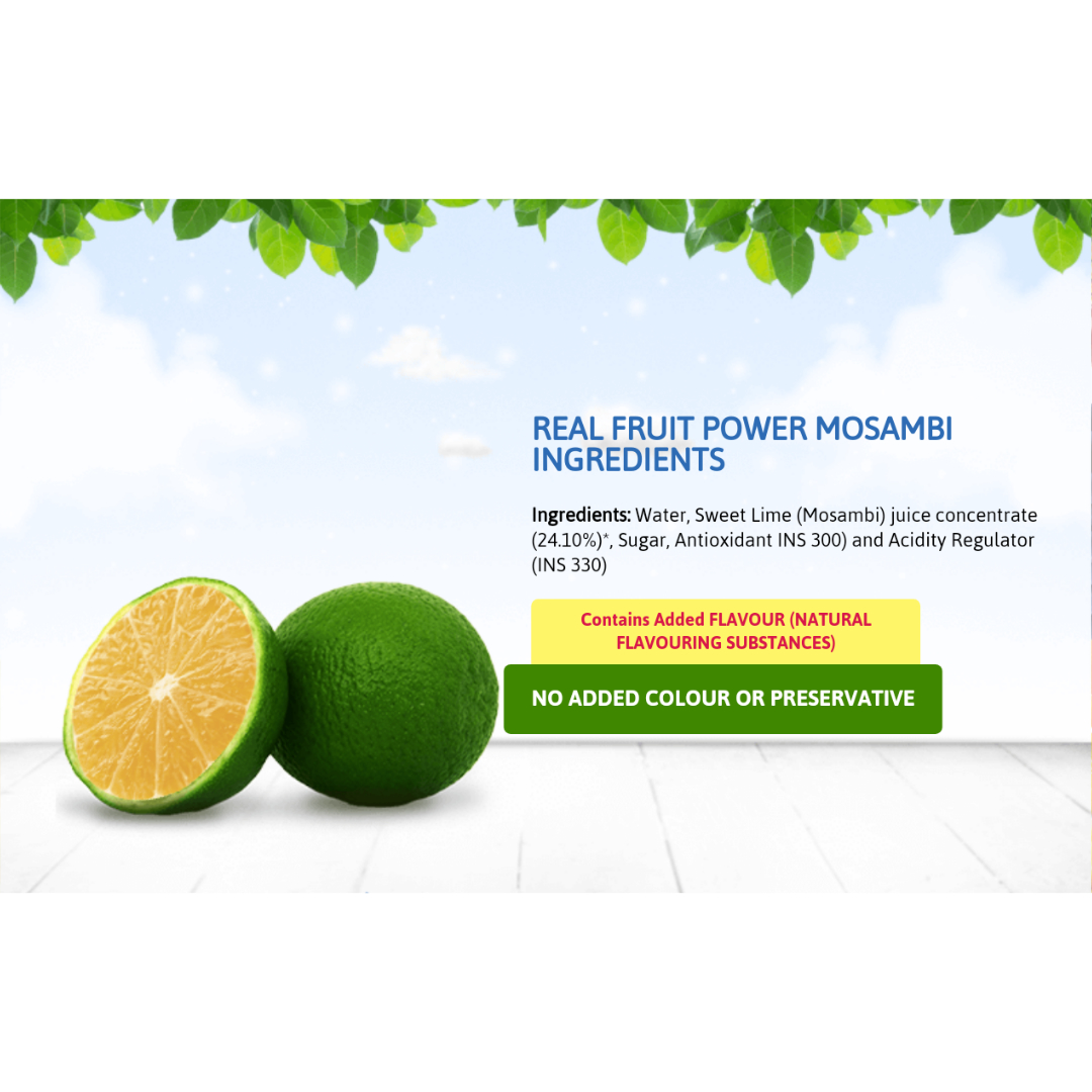 Water, Sweet Lime (Mosambi) juice concentrate (24.10%), Sugar, Antioxidant INS 300) and Acidity Regulator (INS 330).