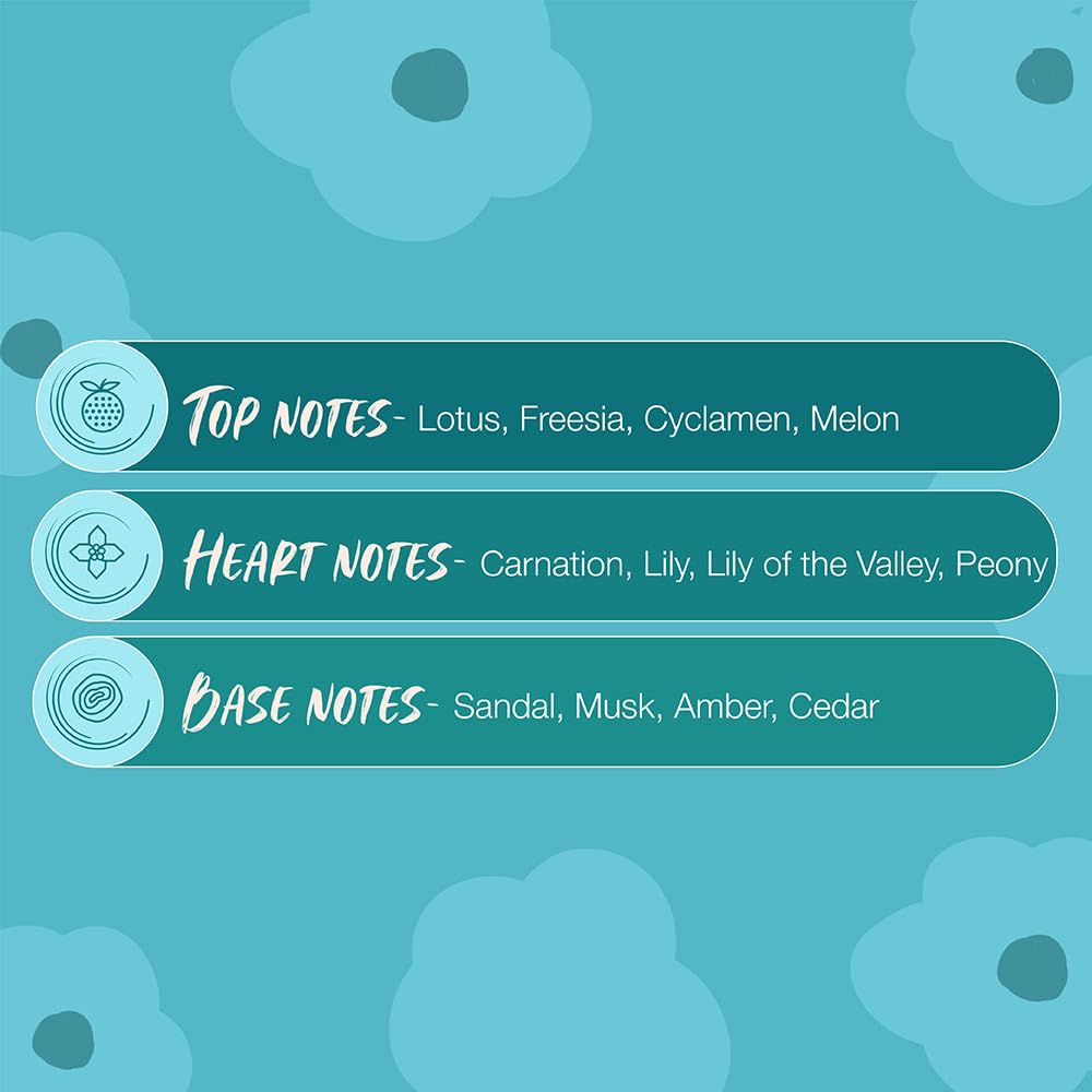 • Fragrance Note: Top Note: Lotus, Freesia, Cyclamen, Melon; Heart Note: Carnation, Lily, Lily of the Valley, Peony; Base Note: Sandal, Musk, Amber & Cedar