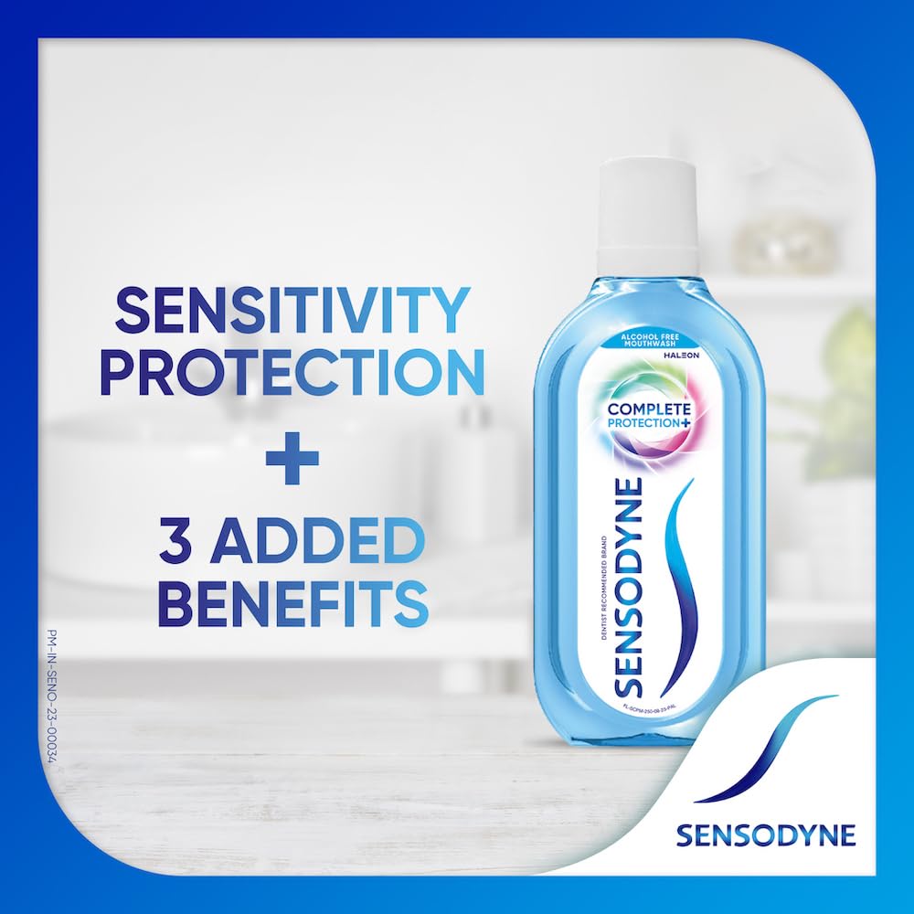 When the protective layer of teeth (enamel) is worn away or gums recede, the dentine underneath can become exposed. When the exposed dentine comes in contact with hot, cold, sweet, sour food and drinks or even toothbrush, it can trigger a sharp short sensation called tooth sensitivity. Sensodyne has designed and formulated an entire range of oral care products (toothpaste, brushes and mouthwash) to help protect people against tooth sensitivity while still providing the benefits of fluoride, cavity protection and fresh breath. Normal eating or drinking exposes teeth to sugars or acids, leaving them vulnerable to wear & tear, specially at night. Sensodyne Complete Protection+ Mouthwash is an effective way to complete your oral health routine. It helps protect against tooth sensitivity as well as provides multiple oral care benefits like lasting freshness, cavity protection and strong enamel. The formulation is uniquely designed without alcohol for apleasant usage experience without burning sensation in mouth. Cool Mint flavor gives lasting freshness while fluoride protects against tooth wear and cavities. Twice daily usage after brushing helps protects from sensitivity to help you enjoy your favorite foods and drinks without the worry of sensitive teeth. Sensodyne Complete Protection+ mouth wash is available in two pack sizes - 250 ml and 100 ml. For optimal care, use together with a Sensodyne paste & toothbrush. Always follow instructions and guidance included on the pack before use. Sensitive teeth may indicate an underlying problem which needs prompt care by a dentist. If symptoms persist or worsens, consult your dentist.