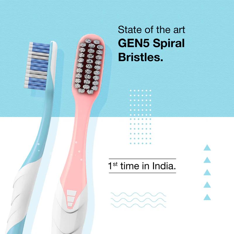 Our Super Sensitive variant is made with Gen5 Spiral bristles that are thick at the base and slim at the top to give you a luxurious and flawless brushing experience while being super gentle on your teeth and gums. A Soft Rubber Tongue Cleaner at the back of the head removes excess bacteria that can improve your sense of taste. Available in 3 exciting colours.