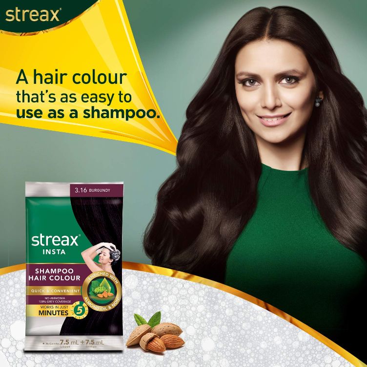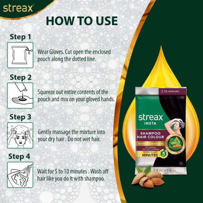 Get natural looking hair colour with ease using Streax insta shampoo hair colour. It is quick and convenient. Just follow the simple instructions and colour your hair in just 5 minutes on your own like never before.
