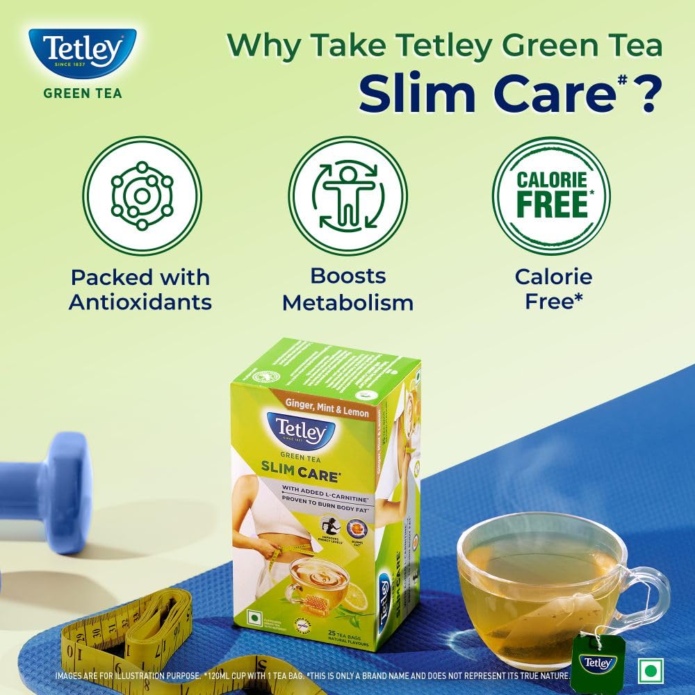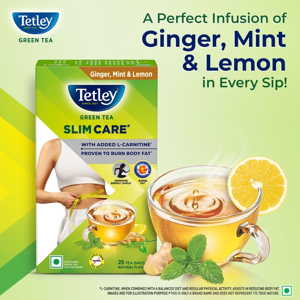 Tetley Green Tea Slim Care—Ginger, Mint and Lemon is made with green tea, natural flavours and L-Carnitine, a natural nutrient proven to burn body fat, when combined with a balanced diet and regular physical act. Infused with L-carnitine and delicious flavours of ginger, mint and lemon, this green tea offers a wellness boost in every cup. L-Carnitine when combined with a balanced diet and regular physical activity is known to burn large fat molecules. Tetley Green Tea Slim Care is packed with antioxidants that cleanse your body from within and refreshes all your senses. It has no added sugar and is calorie-free when made with 120ml cup with 1 tea bag. Making it an excellent choice for those seeking an active lifestyle. Each staple-free tea bag ensures safe and hassle-free brewing. Enjoy a cup any time of the day – Take Tetley Green Tea Slim Care for a refreshing start to the day or pre or post workout. This is your step towards an active lifestyle! Make Tetley Green Tea your wellness partner for all your wellness needs – Tetley Green Tea Slim Care with added L-carnitine, a natural nutrient that burns body fat when combined with a balanced diet and regular physical activity. Tetley Green Tea Beauty Care with added Biotin that supports hair and skin Tetley Green Tea Immune Range that has antioxidants that cleanse the body from within and added vitamin C that supports your body’s immune system. Storage Instructions: Keep the tea bags in a cool, dry place away from moisture and direct sunlight to maintain flavor.