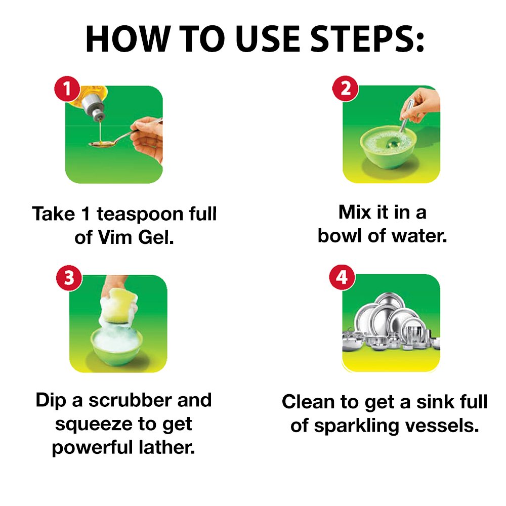 For cooking vessels, add a drop of Vim gel directly on the scrubber and wash to get rid of tough stains. For other utensils, tiffins and dishes, take a spoonful of Vim, mix it in a bowl of water use the mixture to wash.