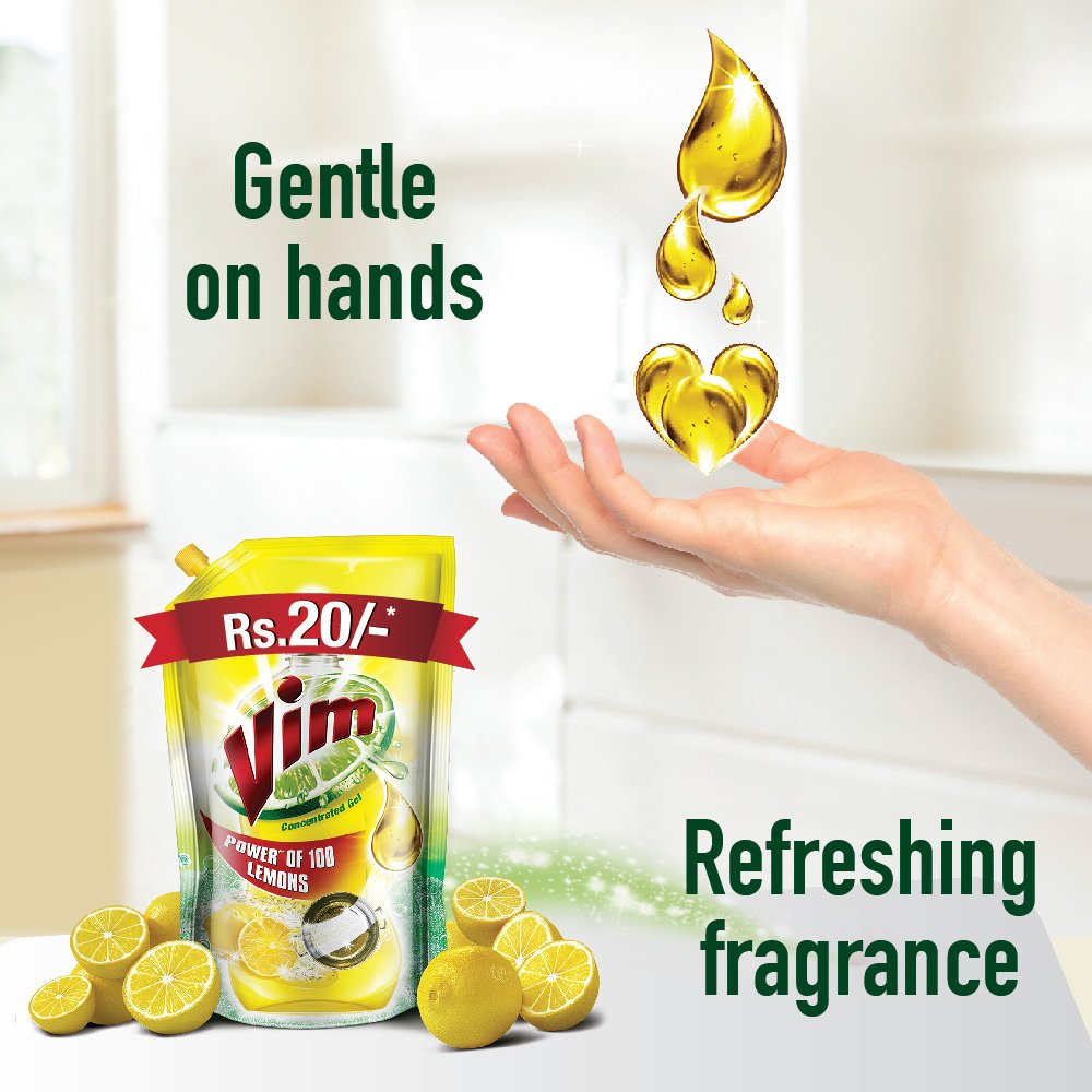 - Vim gel has the power of 100 lemons, which helps clean dishes easily.
