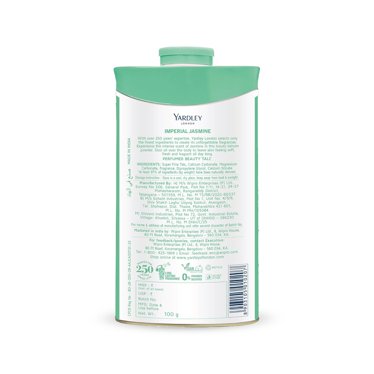 The Yardley Imperial Jasmine Talcum Powder is a luxurious body powder with a rich floral fragrance of jasmine that keeps your skin fresh and pleasantly scented throughout the day. Its fine, smooth texture helps absorb excess moisture and control sweat, leaving the skin soft, dry, and comfortable. With its long-lasting, elegant aroma, it adds a refreshing and feminine touch to your daily routine.